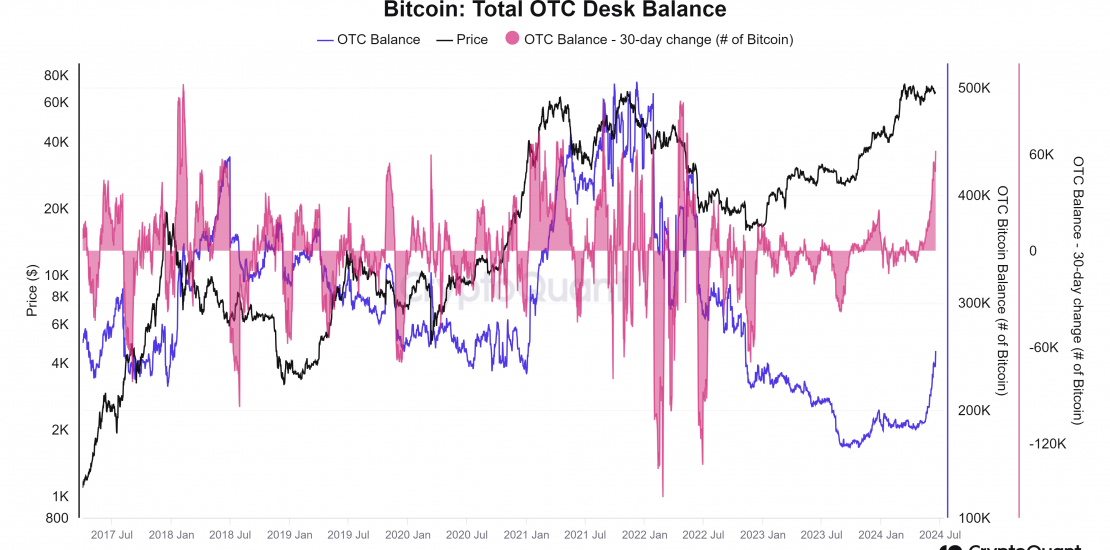 In October 2023, the OTC desk balance stood at 168,000 BTC, growing by approximately 85,000 BTC by June 17, 2024. The recent 30-day change, adding over 62,000 BTC, is one of the highest levels since mid-2018 and 2021, highlighting significant market movements.