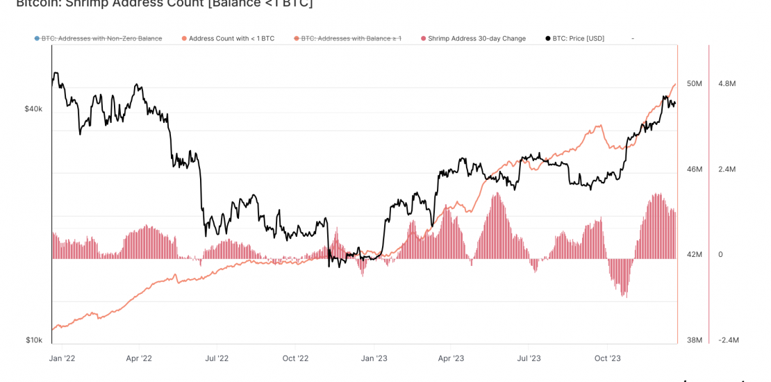 Meanwhile, ‘Shrimp’ addresses (those with less than 1 Bitcoin) crossed the 50 million mark, a significant increase of over 1.3 million in the last 30 days. These numbers paint a picture of small-scale investors strategically increasing their Bitcoin holdings in light of the ETF developments.
